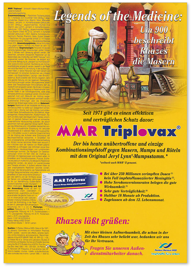 Der bedeutende persische Arzt und Alchemist „Rhazes“ ist Ausgangspunkt dieser Aktion. Er lieferte um 900 eine erste, reletiv konkret Beschreibung der Masern. Damit stellten wir die Verbindung zu MMR Triplovax® her.