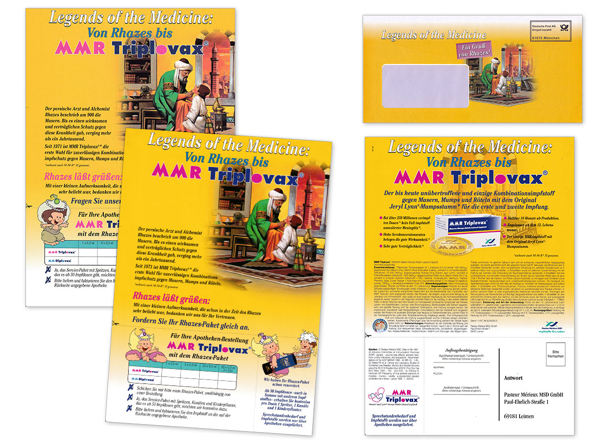 Um eine ganz klare Abgrenzung zu dem vom Mitbewerber vor kurzem eingeführten MMR-Impfstoff zu erreichen, stellten wir in allen Werbemitteln deutlich heraus, dass MMR Triplovax® der einzige Kombinationsimpfstoff gegen Masen Mumps und Röteln mit dem Original mit Jeryl Lynn™-Mumpsstamm ist.Darüber hinaus stand die über 26jährige Erfahrung und erwiesene Sicherheit dieses Kombinationsimpfstoff sowie die Vorteile, die sich für den Arzt daraus ergabt, im Vordergrund.