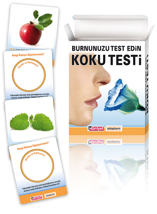 Für den Test sollte man kurz mit dem Zeigefinger die gekennzeichneten Felder reiben und gleich danach den Duft riechen. Die Lösungen befanden sich auf der Rückseite der Karten. Mit dem Geruchstest konnten die Leser auch Freunde und Verwandte überreschen.